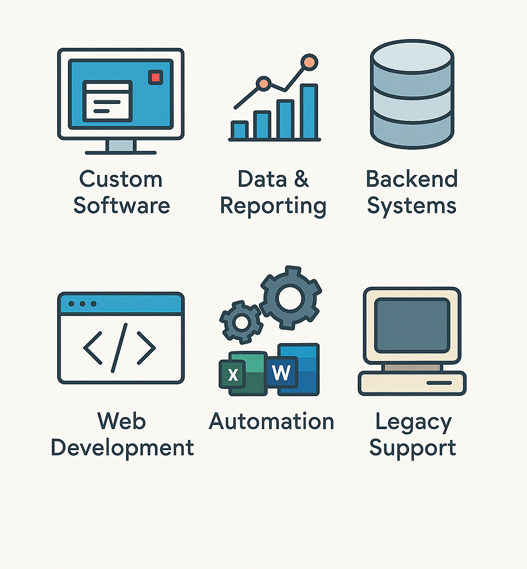 Database & Backend Solutions - Using MySQL, SQL Server, MS Access – structured and secure.